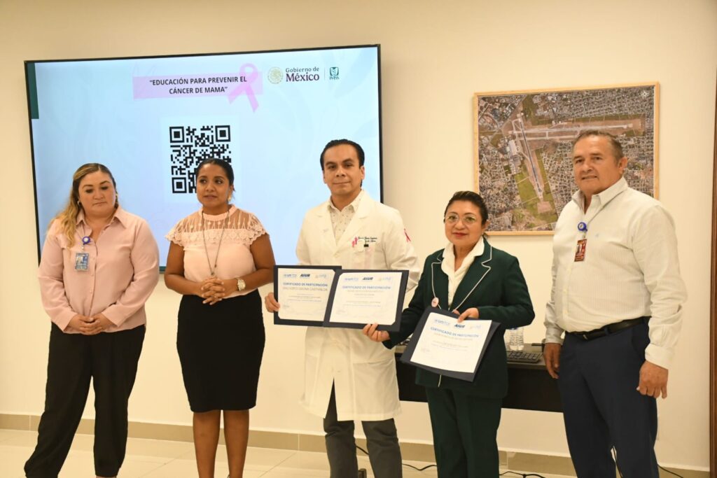 The session took place in the airport’s multipurpose hall and was led by specialists from the IMSS Breast Cancer Detection and Diagnostic Unit. The team was headed by Dr Gregorio Gaona Castañeda and Public Health Nurse Specialist Ms Juanita Matilde Medina Azcorra, under the direction of Dr Jose Alberto Vivar Mundo.